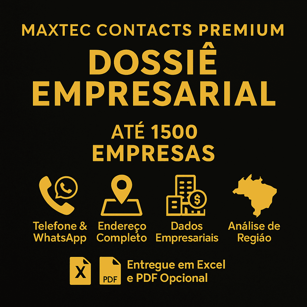 O Dossiê Empresarial MaxTec Contacts Premium reúne até 1.500 empresas com dados completos e segmentados, ideal para prospecção profissional, campanhas de remarketing, análise de região e estudos de mercado.