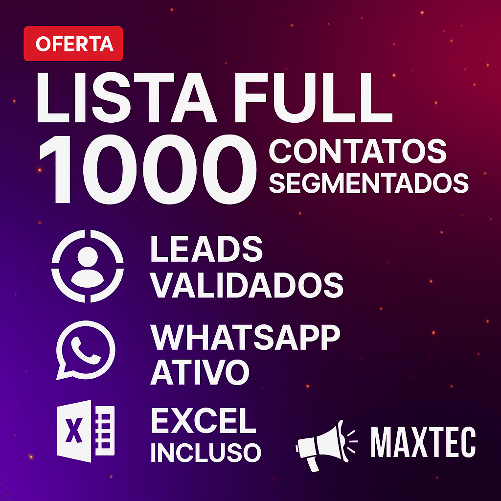 A Lista Premium MaxTec Contacts oferece até 1.000 contatos empresariais segmentados, incluindo telefone, WhatsApp ativo e endereço completo.